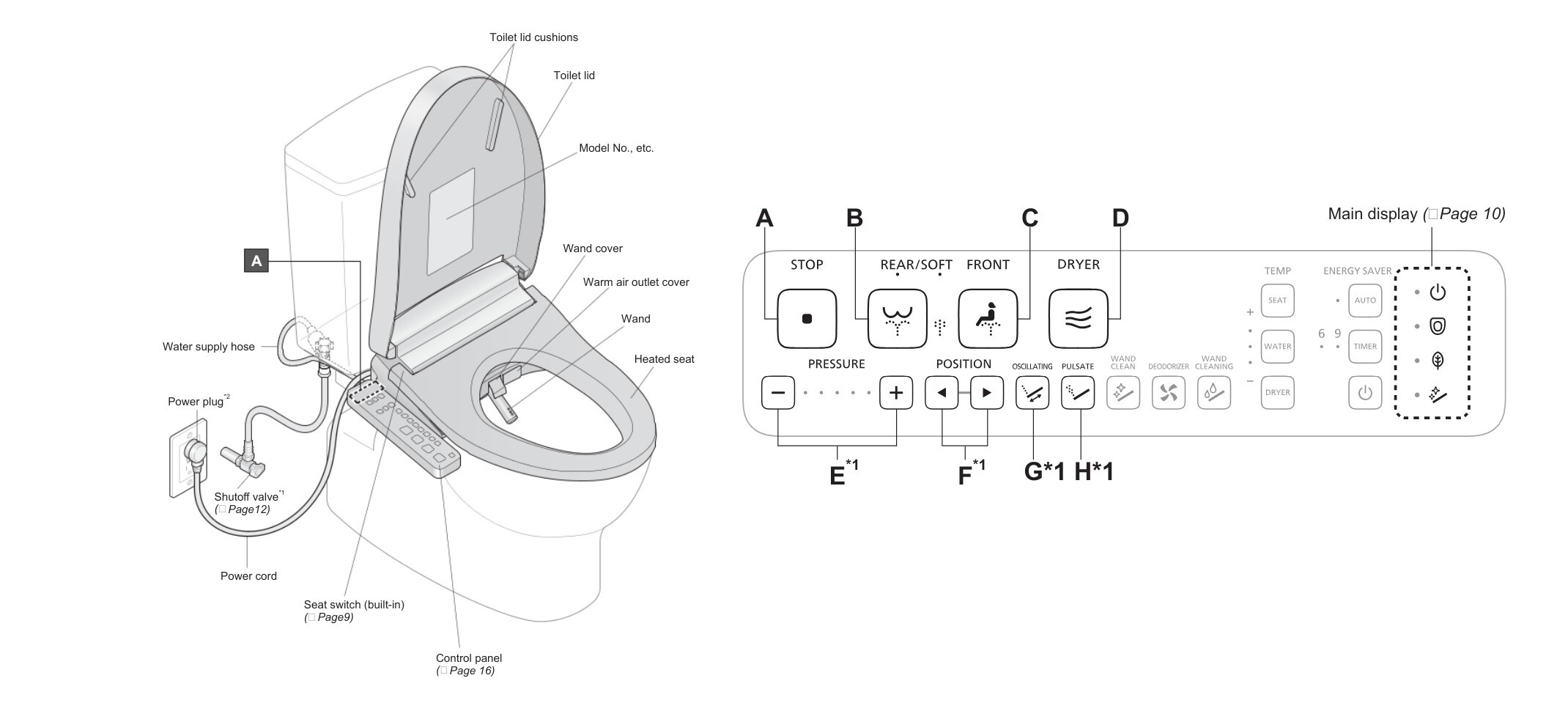 - Energy Saver LED: Indicates whether the washlet is in energy-saving mode. When it’s on, Energy Saver is active, and the unit is reducing heater usage to save power. When it’s off, the function is not active, and the unit is running at full user-selected settings.
