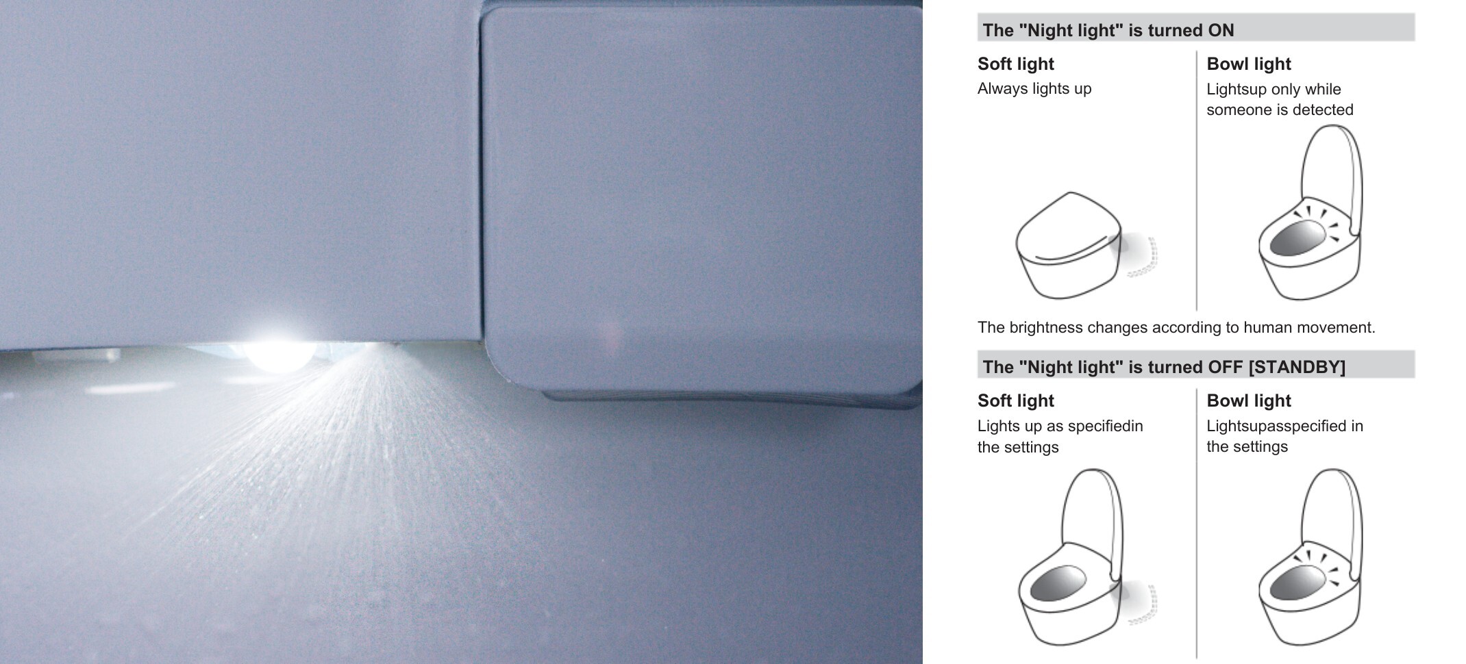 - Bowl Light: Illuminates the inside of the toilet bowl. When it’s on, the bowl light turns on only when it detects a person approaching or standing in front of the unit. When it’s off (or in standby), the bowl light behaves according to normal settings rather than night-mode behavior.