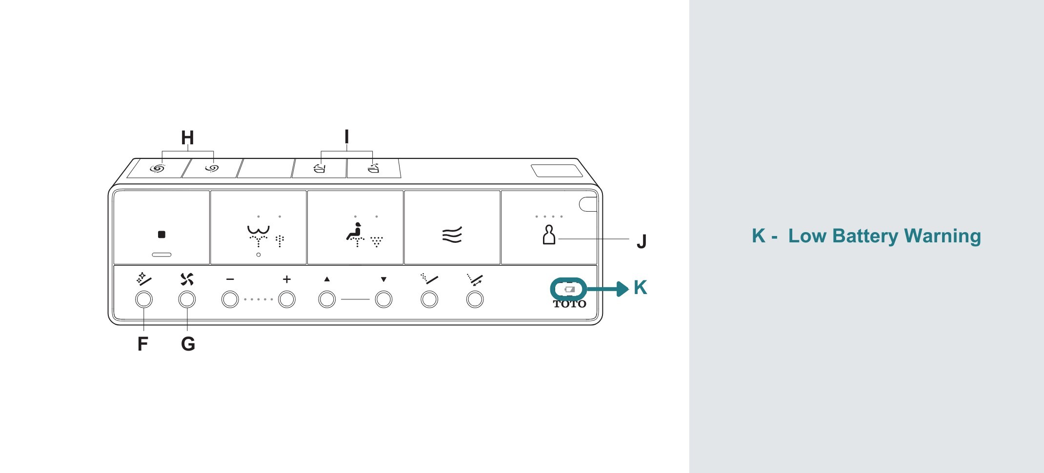 - Energy Saver LED: Indicates Energy Saver mode is active. When it’s on, it means the washlet is automatically reducing power usage by lowering heater temperatures or entering standby mode.