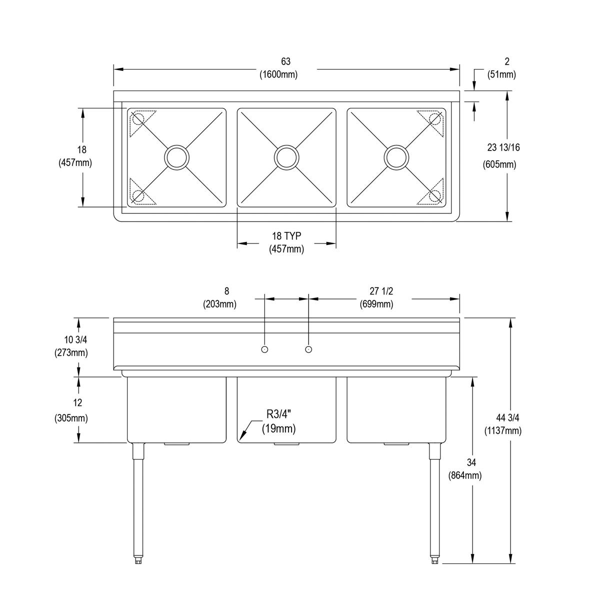 Elkay Dependabilt Stainless Steel 63" x 23-13/16" x 44-3/4" 16 Gauge Three Compartment Sink with Stainless Steel Legs